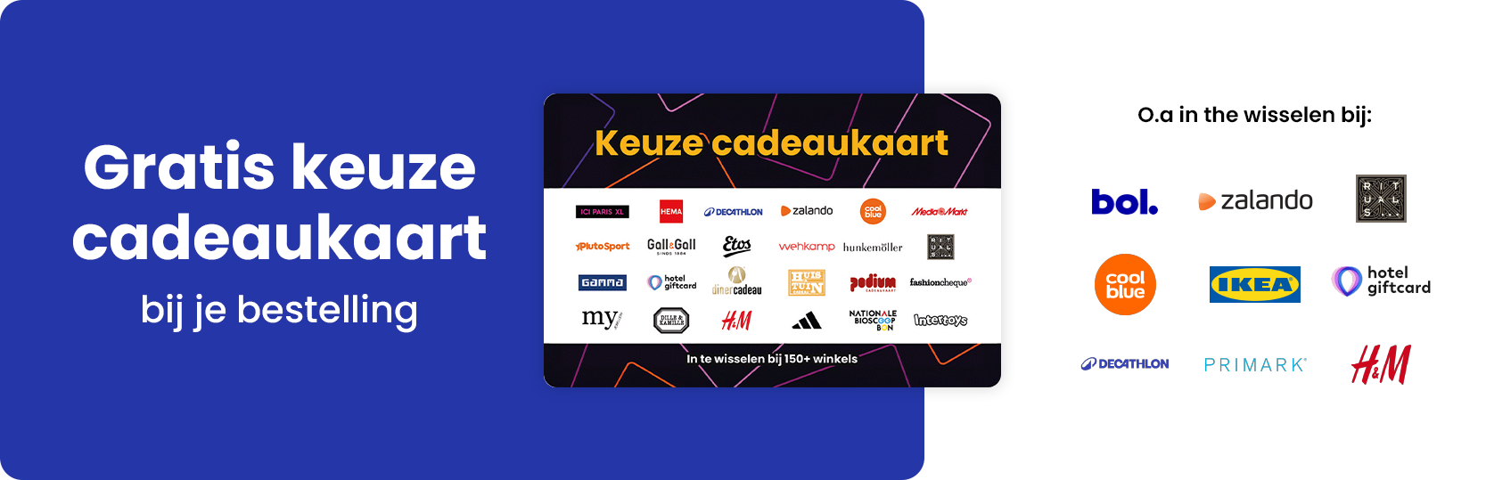 te besteden bij meer dan 150 winkels zoals Coolblue, H&M en Zalando. Het enige wat je hoeft te doen, is de actiecode toevoegen aan je