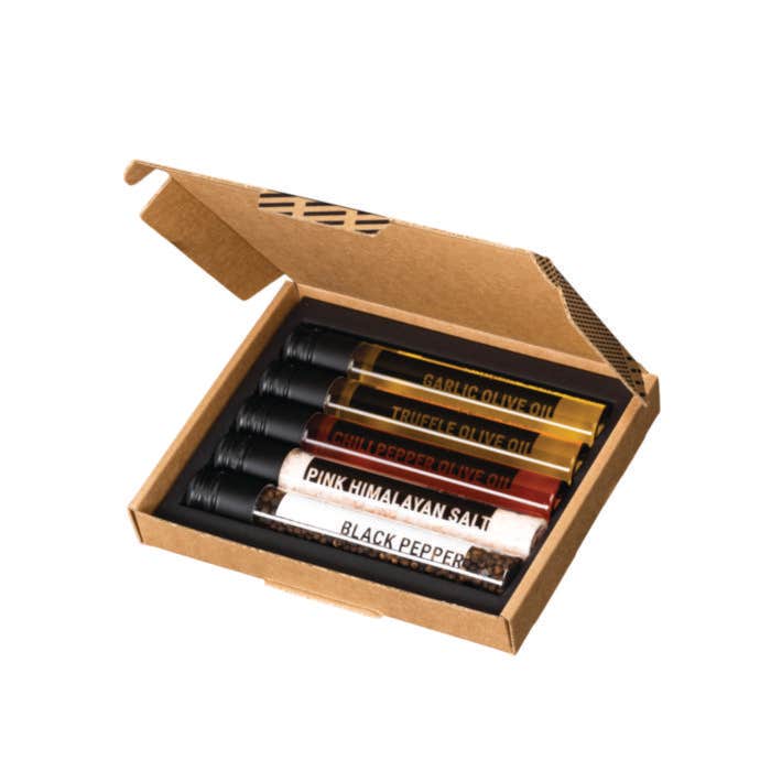 De rPET Kookbox Somethin's Cooking is een smaakvol 5-delig verwenpakket dat je kunt laten bedrukken met jouw bedrijfslogo. Deze luxe kookbox bevat Himalaya zout, zwarte peper en drie premium olijfoliën van Liquido d'Oro: truffel, chilipeper en knoflook. Gemaakt in handige rPET tubes, past dit culinaire geschenk door de brievenbus, wat het ideaal maakt om jouw relaties te verrassen met een smakelijk en duurzaam cadeau.